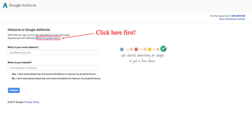 3. 當(dāng)歡迎頁面Welcome to Google Adwords!加載完成后,點擊藍色鏈接Skip the guided tour(參考上圖)。