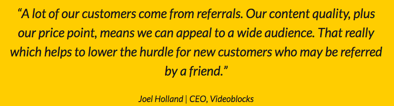 制作一支原生影片所使用到的素材可能會非常昂貴,但是Video Block 顛覆了業(yè)界的常規(guī),它提供影片素材,從短片、背景、特殊效果、甚至到AfterEffects 范本等,不論每個月下載多少內(nèi)容,都均一收費(fèi),但現(xiàn)在Referral Program 并沒有直接在網(wǎng)站上揭露。不過根據(jù) Video Block 的 CEO 的引言,推薦營銷的策略的確讓他們更不費(fèi)力地招來更多許多新客戶,而 Refferral Candy 的個案研究也顯示出 Video Blocks 透過推薦營銷賺進(jìn) 10 萬美元。